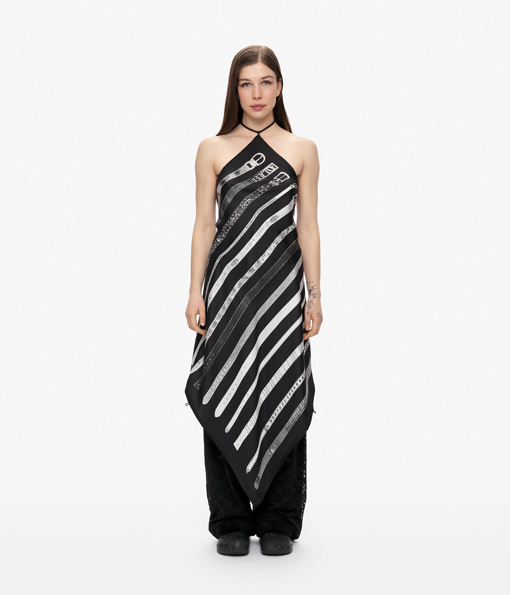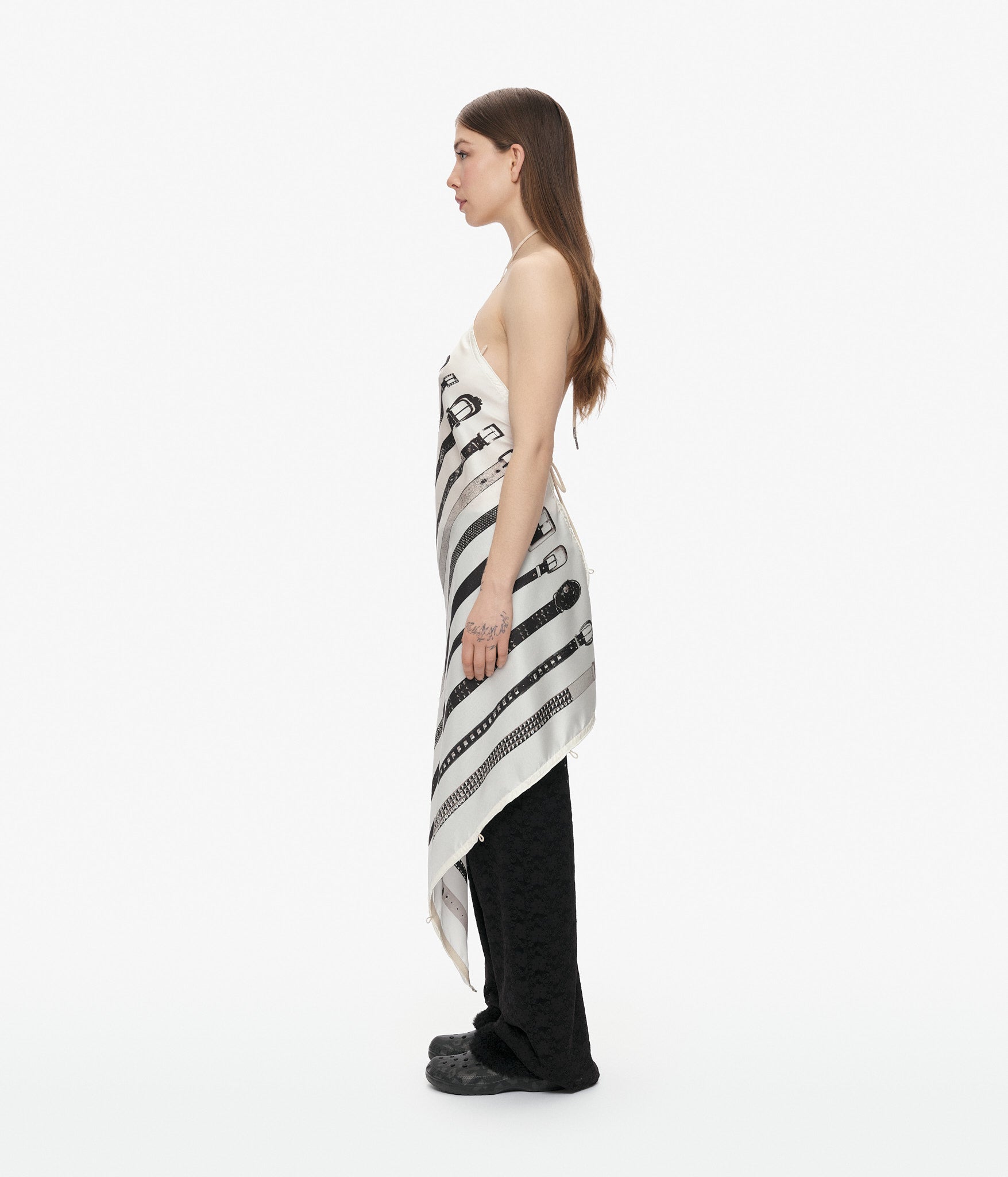 Discover endless styling possibilities with this ingeniously designed square silk scarf. Thirteen strategically placed loops invite you to experiment with tying, looping, and lacing techniques, transforming the piece to suit your mood and wardrobe.