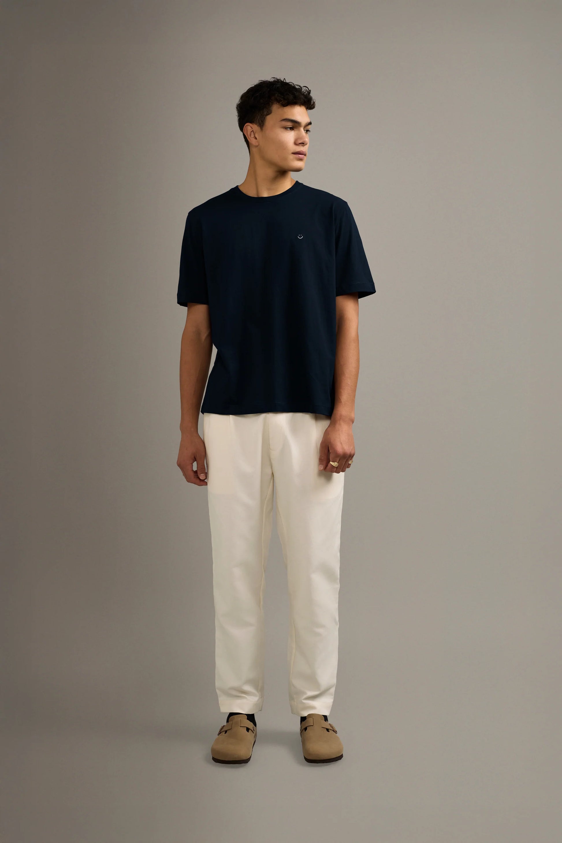 Elevate your everyday wardrobe with this timeless navy crew tee. Thoughtfully designed with a polished neckline and precision top stitching, it features chain stitch detailing along the sleeves and hem for that extra touch of craftsmanship. The cheerful white smiley embroidery adds personality and warmth to a piece you'll reach for again and again. Perfect for layering or wearing solo, this is the reliable staple that deserves a place in every closet.