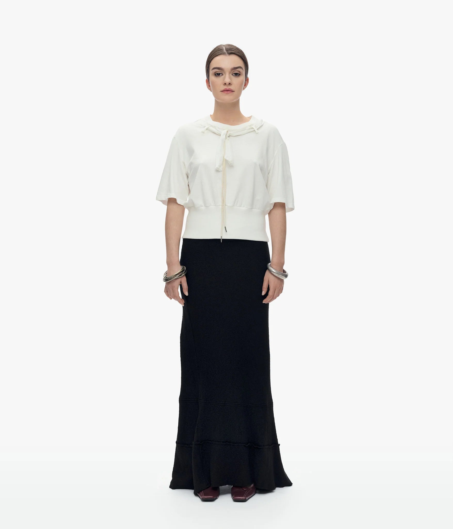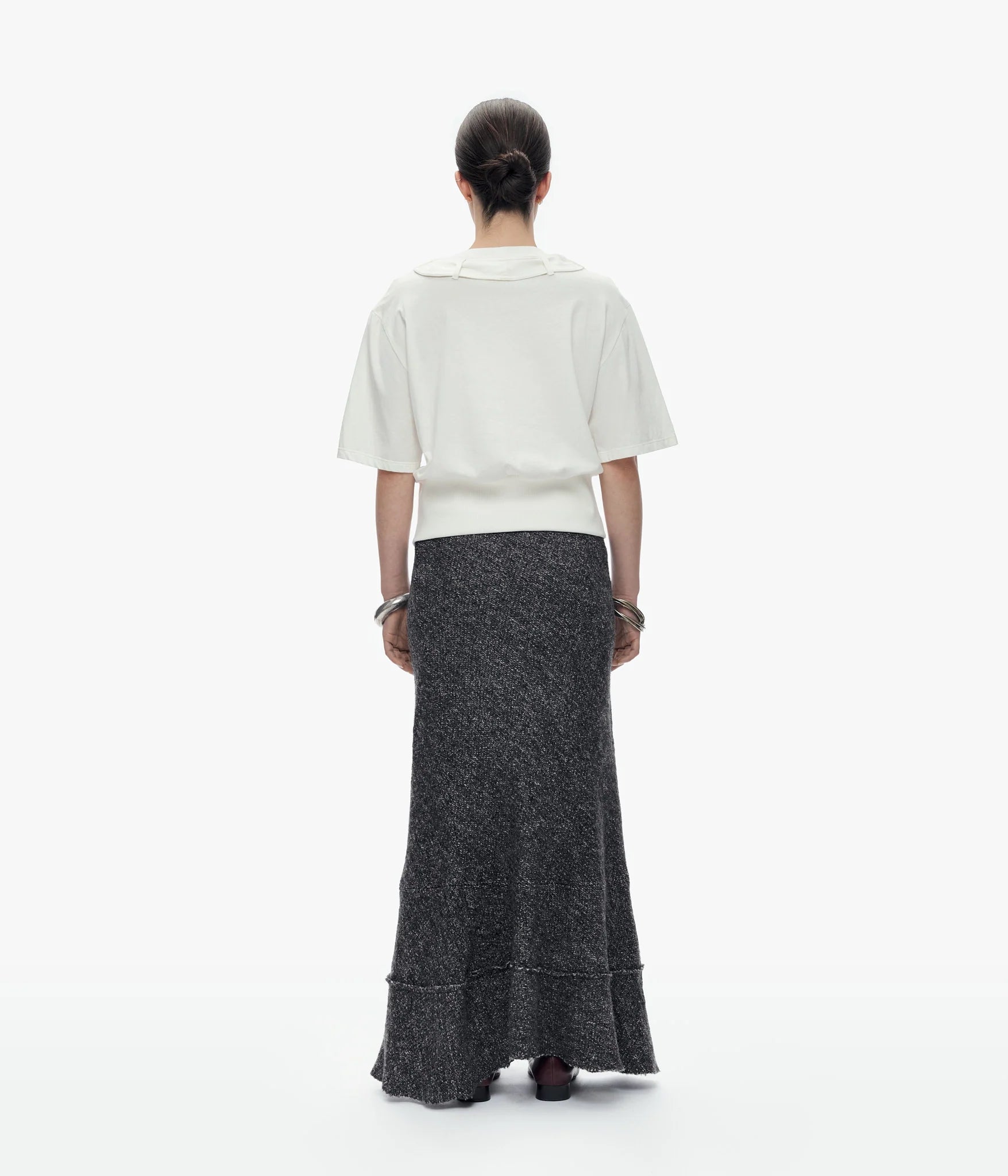 Made from bias cut boiled wool, featuring an invisible zipper and full lining.