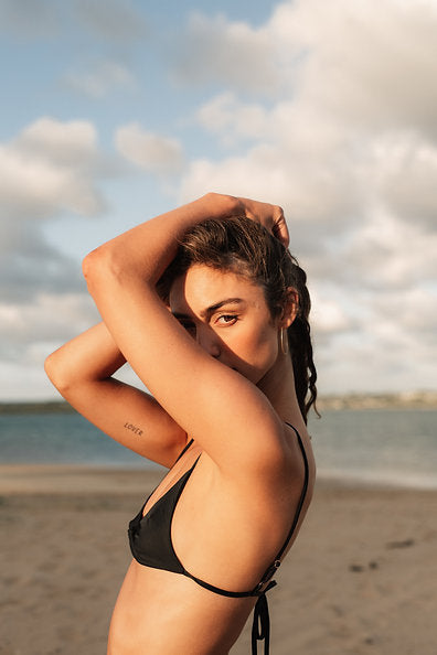 The Ziggy top features a scoop neck with a front twist and adjustable straps. Made with premium Italian recycled fabric, mix and match with the rest of the AND.BEAR bikini collection. Available in sage and black. (Bikinis made in Bali, Indonesia.)
