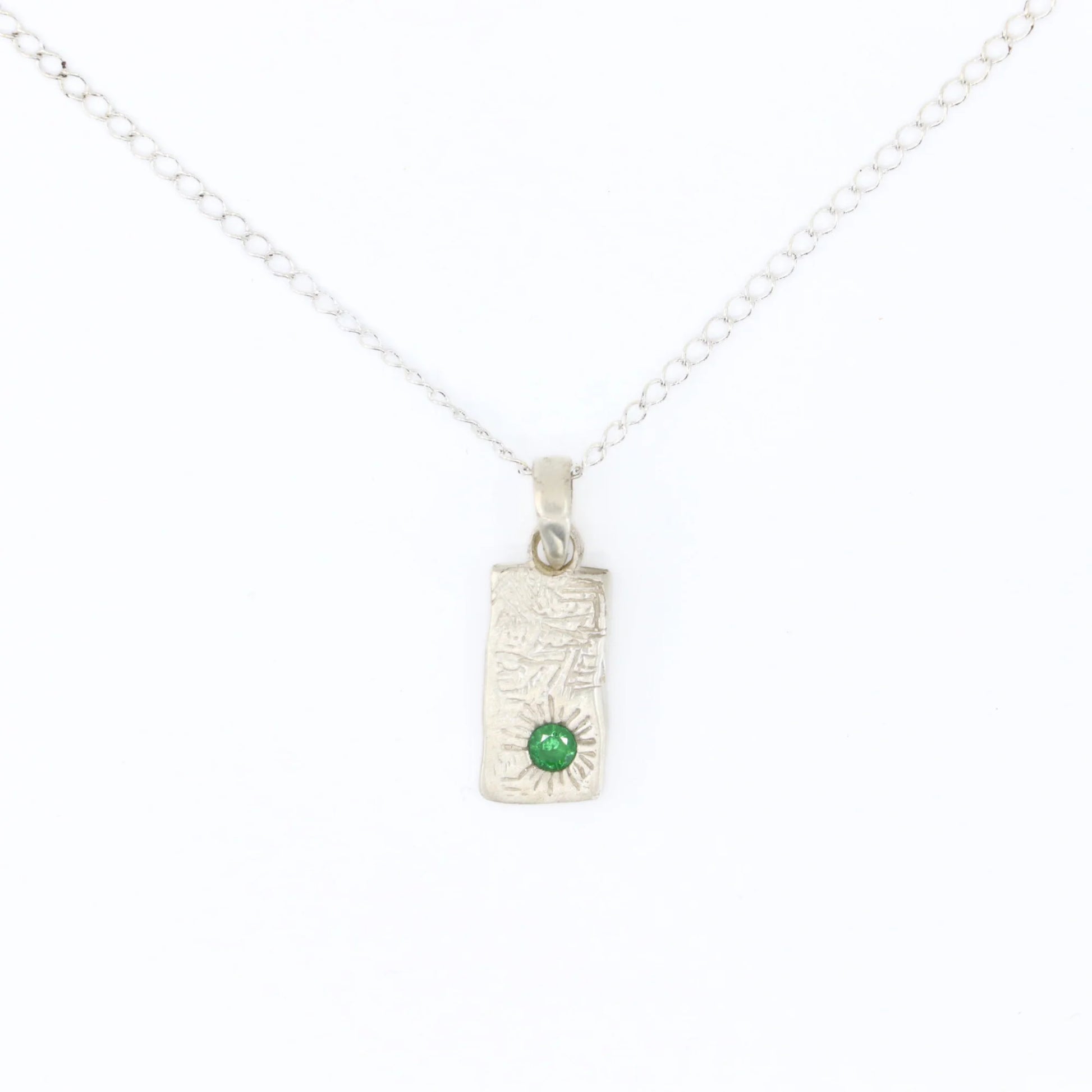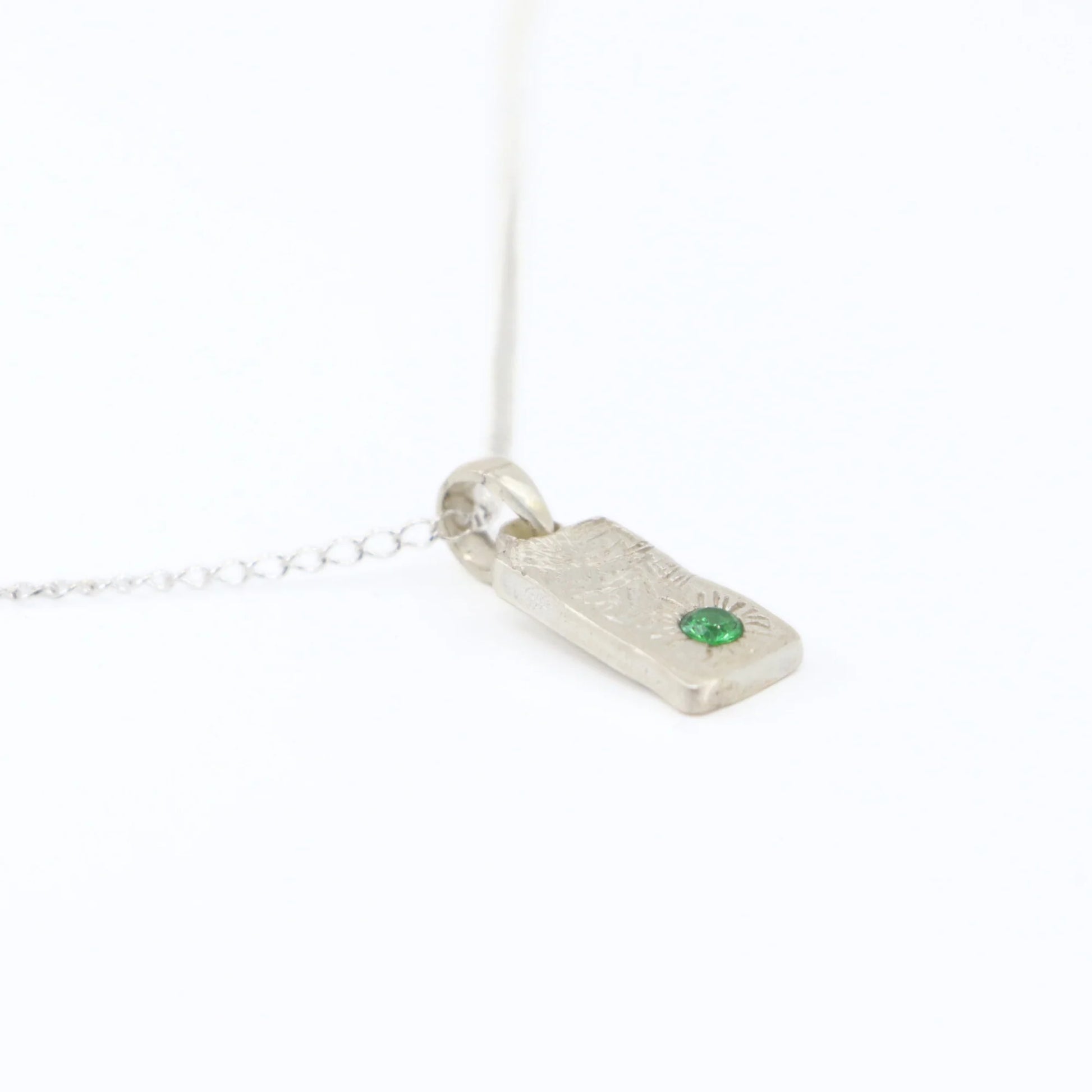 The Dinner Plate Pendant is made by hand from sterling silver. Finished with a 3mm round emerald stone.