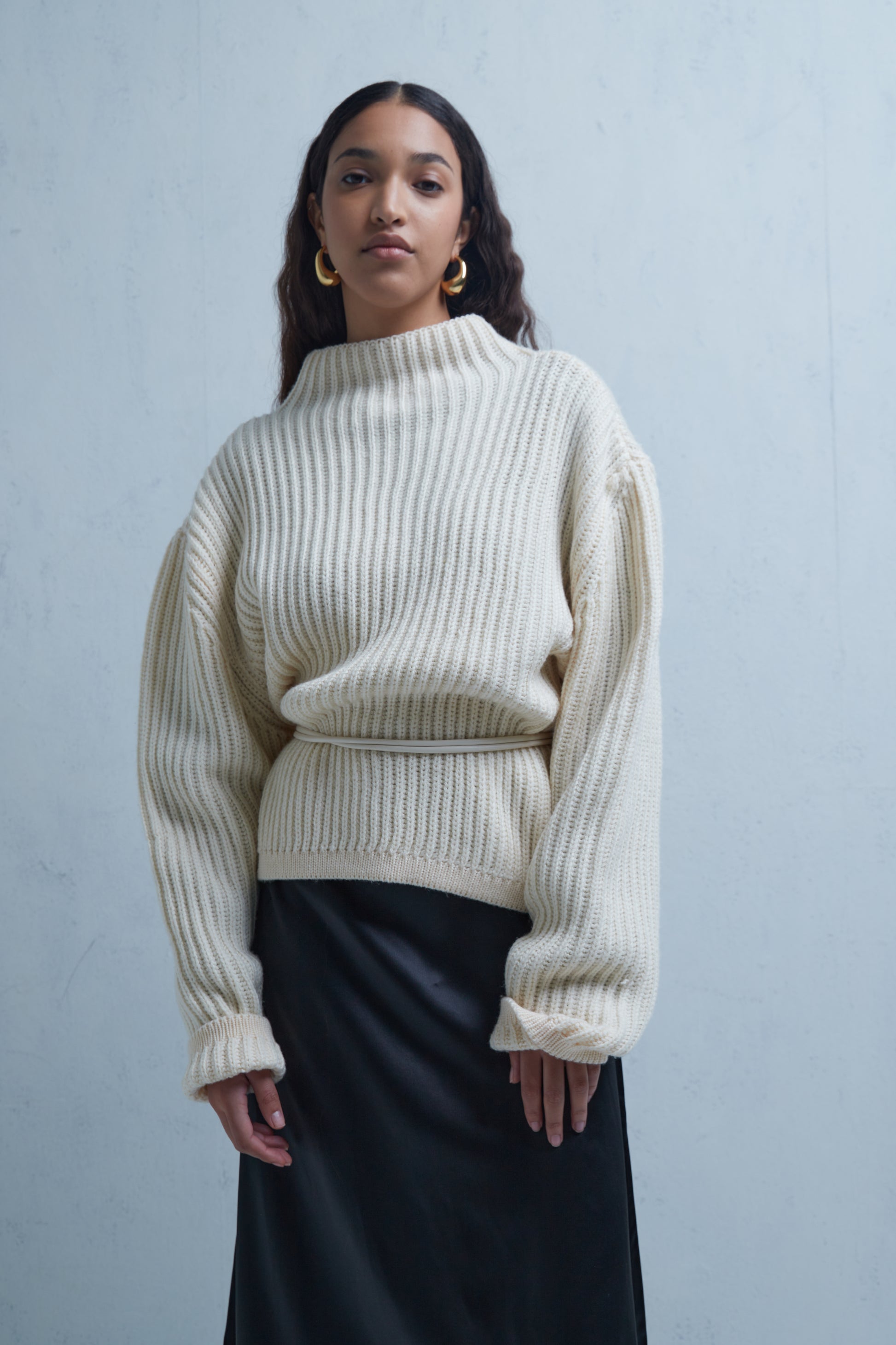 This cozy wool sweater will keep you warm and stylish on chilly days. The unique fisherman rib knit adds texture and charm, while the fun funnel neck adds a touch of sophistication. Stay fashionably comfortable with this versatile sweater.